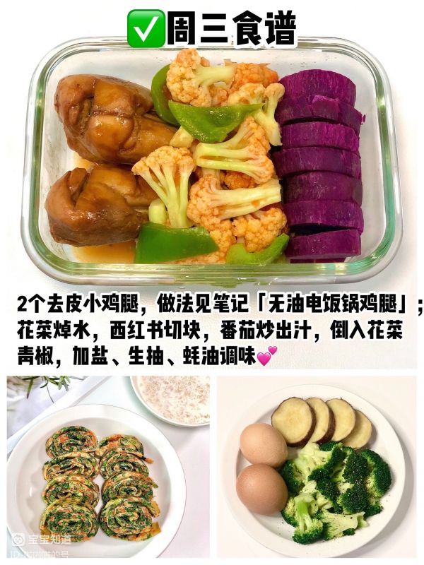 午:無油電飯鍋鹵雞腿2個(gè)+茄汁花菜+紫薯100克