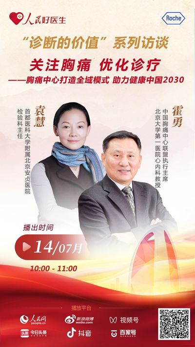 7月14日10:00至11:00,中國胸痛中心聯(lián)盟執(zhí)行主席、北京大學(xué)第一醫(yī)院心內(nèi)科教授霍勇,首都醫(yī)科大學(xué)附屬北京安貞醫(yī)院檢驗科主任袁慧將做客“人民好醫(yī)生”直播間,共同就胸痛疾病等相關(guān)內(nèi)容和網(wǎng)友進(jìn)行分享,歡迎收看。