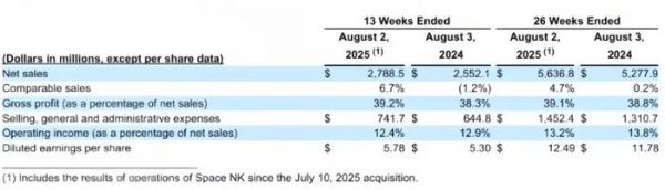 Ulta Beauty在2025年第二季度實(shí)現(xiàn)凈銷售額27.89億美元(約合人民幣199.28億元),同比增長(zhǎng)9.3%,超出分析師預(yù)期的26.7億美元;凈利潤(rùn)為2.61億美元(約合人民幣19.1億元),同比增長(zhǎng)3.3%。