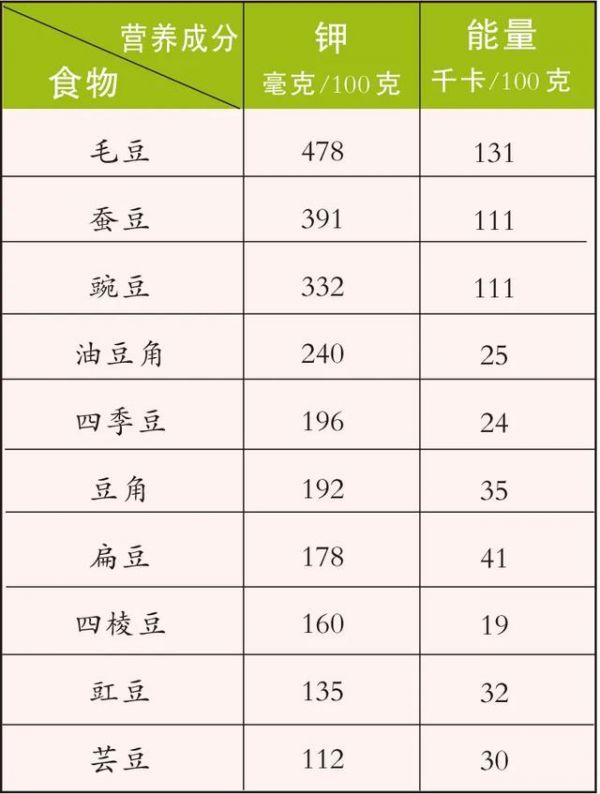 香蕉的鉀含量為256毫克/100克,相較而言,各種豆類菜的鉀含量如下表: