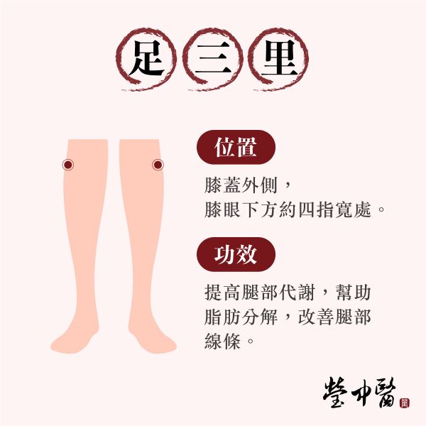 位置:膝蓋外側(cè),膝眼下方約四指寬處功效:提高腿部代謝,幫助脂肪分解,改善腿部線條