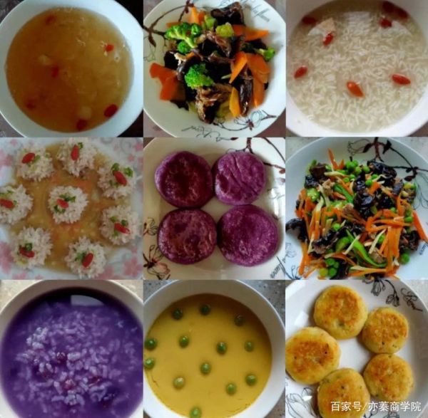 香菇泥米粉、紫米粥、山藥胡蘿卜粥、雙米紅棗粥、芝麻核桃紅棗粥 、土豆胡蘿卜粥、小白菜胡蘿卜泥、萵筍土豆泥、蘋果汁等寶寶的基礎(chǔ)輔食。