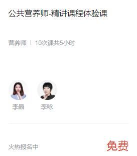 為了助力大家備戰(zhàn)2025年公共營養(yǎng)師考試,環(huán)球網(wǎng)校的教師團隊已經(jīng)為你精心制定了公共營養(yǎng)師的免費學(xué)習(xí)課程,點擊鏈接即可開始免費學(xué)習(xí)2025年公共營養(yǎng)師的課程,快來一起學(xué)習(xí)吧!