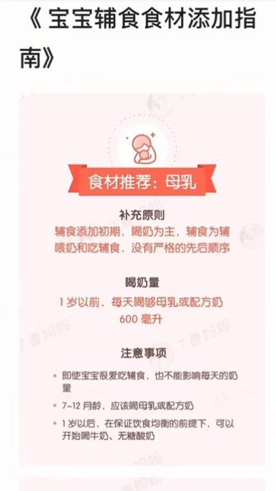 關于奶粉和母乳、米粉、雞蛋、肉類、魚類、蔬菜、水果、油和調味料、水等常見食材的添加原則、添加方法、添加時間、不同月齡添加劑量、添加注意事項、烹飪方法等,我們都匯總在了《寶寶輔食食材添加指南》里。