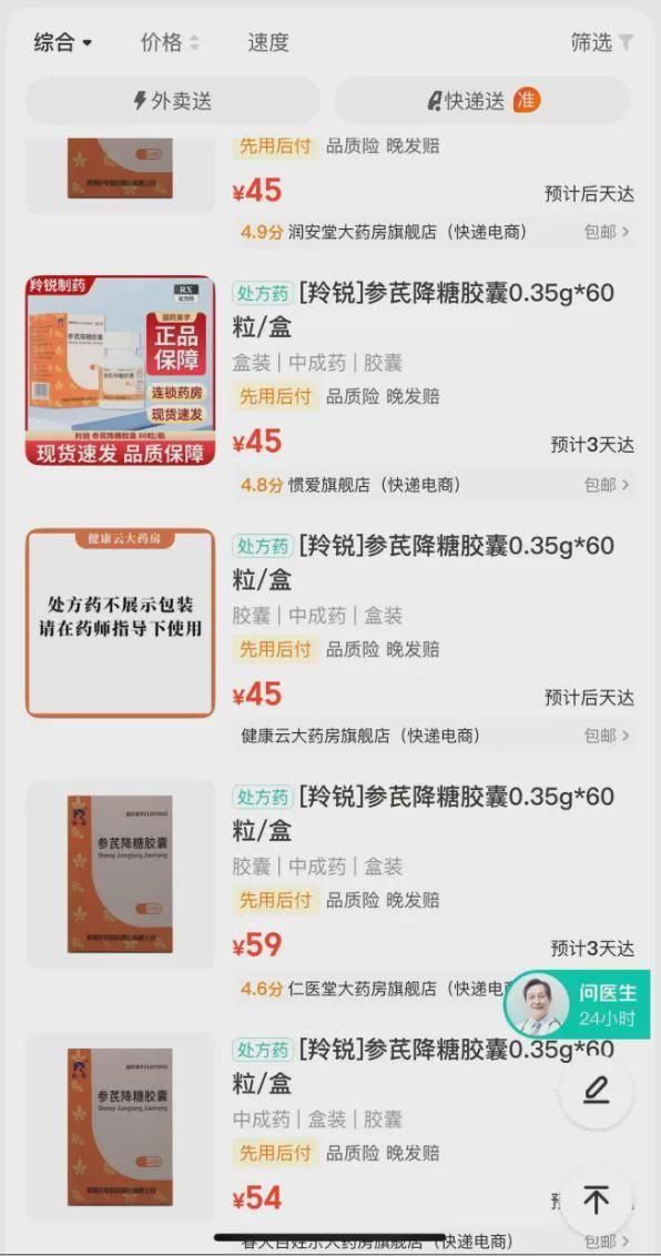 在經(jīng)過多層中間商環(huán)節(jié)后,澎湃新聞查閱電商平臺發(fā)現(xiàn),參芪降糖膠囊終端的零售價格基本在40-50元之間。
