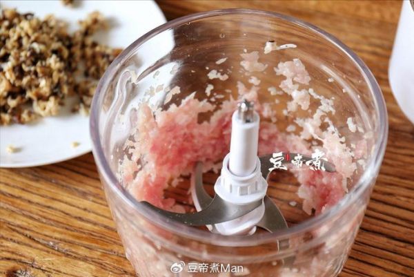 2、所需要的香菇使用干貨來制作,因?yàn)楦韶浀奈兜栏愀凶涛?。為此香菇要提前泡發(fā)擰干然后放入料理機(jī)里打碎,至于肉的選擇有兩個(gè)推薦。一個(gè)是前腿肉口感比較香比較有口感,另一個(gè)是去皮的五花肉。五花肉肥瘦相間口感更香,缺點(diǎn)是有的親們怕油影響減肥。至于用那個(gè)部分大家自行取決,肉和香菇處理成碎之后再準(zhǔn)備好所需要的配料。(沒有料理機(jī)就手剁一會(huì)沒有區(qū)別)