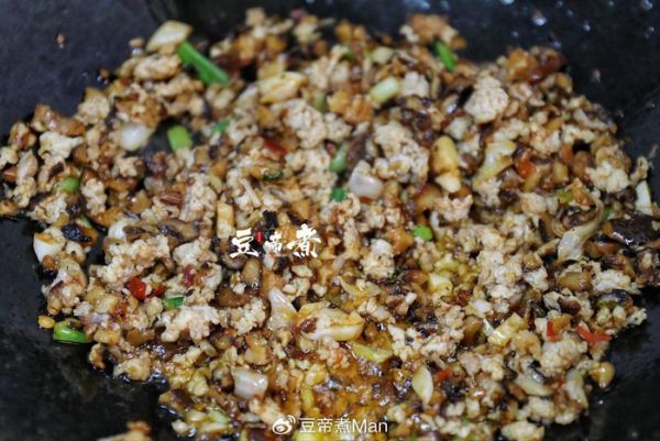 3、全部準(zhǔn)備好之后就能開始烹炒了,鍋熱多一點(diǎn)的油。待油溫升高之后放入香菇末煸炒出香味,然后倒入肉末一并翻炒幾下再倒入蔥白和蒜碎一起炒香。接著舀入一匙豆瓣醬翻炒出紅油炒出味道,一匙豆瓣醬可以賦予材料更好的味道為此不要少了。