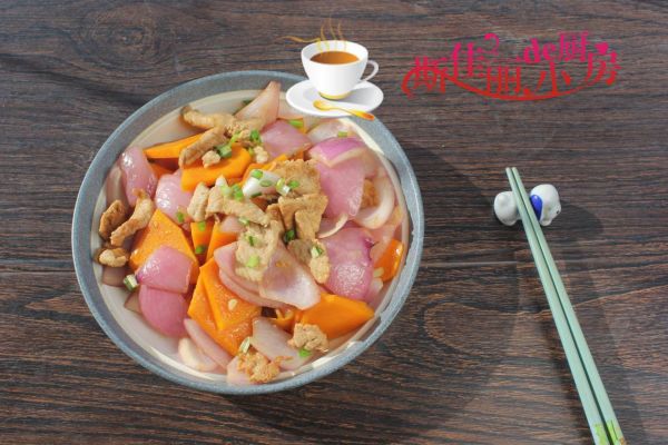 原料:里脊肉 1小塊 洋蔥 1個(gè) 南瓜 1小塊 淀粉 1勺 料酒 1勺 生抽 1勺 蔥花 1勺 油鹽 適量