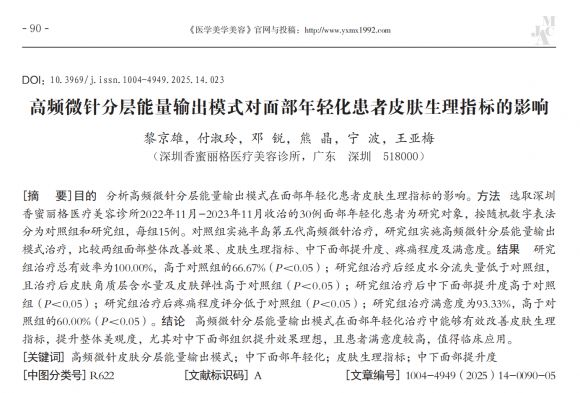同年。黎京雄醫(yī)生團隊再次在《中國醫(yī)療美容雜志》上發(fā)表論文《微聚焦超聲技術(shù)在提升面部皮膚治療中的臨床觀察》,為設(shè)備臨床應(yīng)用提供關(guān)鍵循證依據(jù)。
