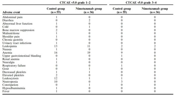 本研究最常見(>5%)的不良反應(yīng)主要是貧血、白細胞減少、白細胞增多和中性粒細胞減少,對照組中1-2級的不良反應(yīng)主要是貧血、白細胞減少和白細胞增多,研究組中貧血和白細胞減少是最常見的不良反應(yīng)。研究組中有2名患者出現(xiàn)3級白細胞減少的不良反應(yīng)。在接受對癥治療后,兩組所有3級不良事件均成功緩解。未發(fā)生4級不良反應(yīng)。