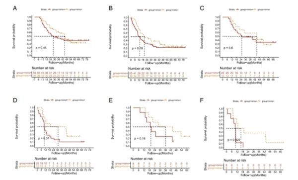 圖2尼妥珠單抗組和對照組的Kaplan-Meier生存曲線。(A) 總生存期。(B 無病生存期。(C) KRAS基因突變亞組的總生存期。(D) KRAS基因突變亞組的無病生存期。(E) KRAS G12D突變亞組的總生存期。(F) KRAS G12D突變亞組的無病生存期。