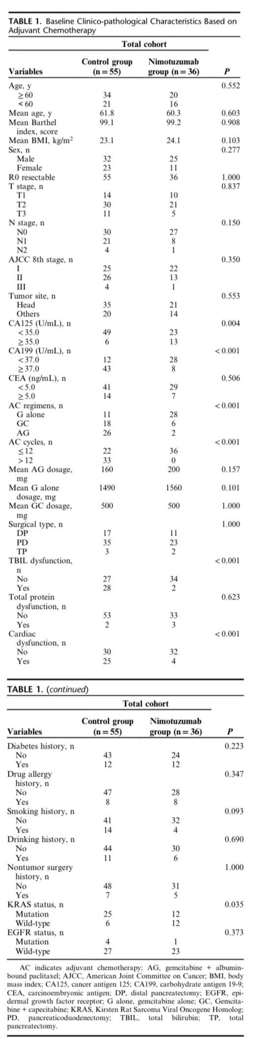 本研究共納入91例R0患者。對照組55例,研究組36例。所有患者均R0切除,兩組平均年齡均為61歲,平均Barthel評分99分。尼妥珠單抗每周400mg,中位暴露時間為4周。兩組之間不平衡的因素包括:CA125、CA199、AC方案、AC周期以及總膽紅素、心臟功能。此外,研究收集了EGFR和KRAS基因檢測結(jié)果。