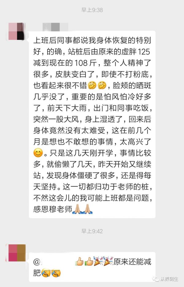 很多樁友站樁一段時間都紛紛在群里反饋,站樁后覺得自己瘦了很多,確切地說是身上的肉和皮膚緊致了許多。因為有些樁友的體重并沒有什么變化,甚至還增加了,但視覺上看上去卻瘦了。