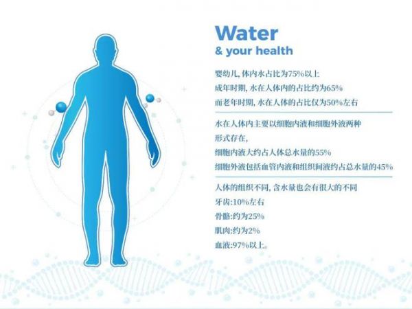 年齡越小,水占人體的比重就越高。比如嬰幼兒時期,體內(nèi)水占比為75%以上;成年時期,水在人體內(nèi)的占比約為65%;而老年時期,水在人體的占比僅為50%左右。從某種意義來講,人老而衰的過程也就是人體含水量逐漸降低的過程。