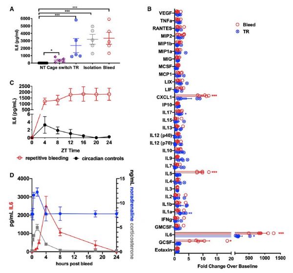 研究團隊對小鼠進行籠轉(zhuǎn)換、社會隔離、管束縛、取血等急性應(yīng)急刺激。研究發(fā)現(xiàn)在外界壓力的刺激下,小鼠血漿中的細(xì)胞因子—IL-6水平顯著升高,且顯著高于其它細(xì)胞因子。