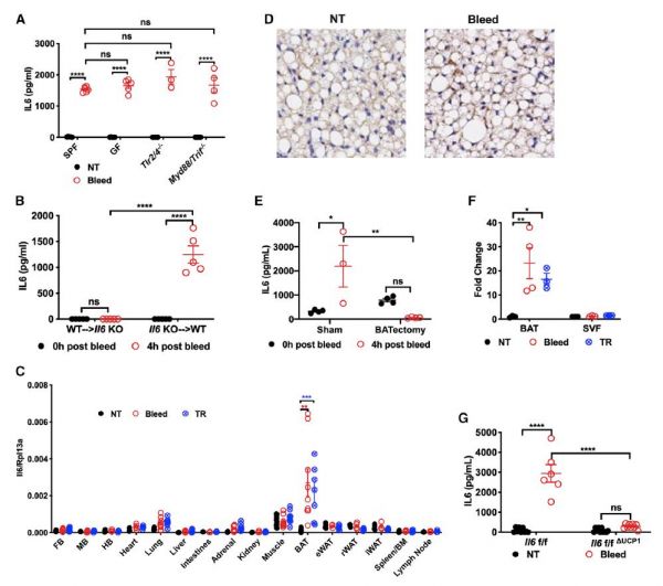 隨后,研究人員通過以下實驗確定了IL-6是由棕色脂肪細(xì)胞在應(yīng)激壓力誘導(dǎo)下分泌產(chǎn)生:
