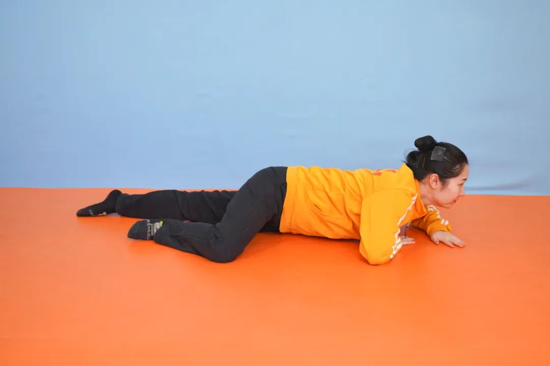 要求兒童俯趴于地面,頭部微微抬起,腿部和手部協(xié)調(diào)向前,匍匐爬行,爬行過(guò)程小腹不能離開地面,四肢都要用力并保持協(xié)調(diào)。