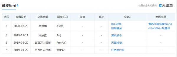 資本同樣看好代餐的發(fā)展。天眼查數(shù)據(jù)顯示,成立于2019年1月的WonderLab,截至目前已經(jīng)累計完成4輪融資,投資方包括了IDG資本、凱輝基金等多家投資機構(gòu)。