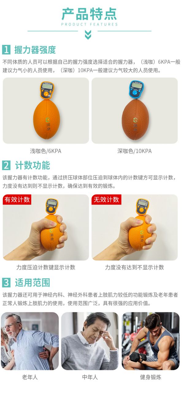 1、不同體質的人員可以根據(jù)自己的握力強度選擇適合的握力器,(淺咖)6KPA一般建議力氣小的人員使用,(深咖)10KPA一般建議力氣較大的人員使用。
