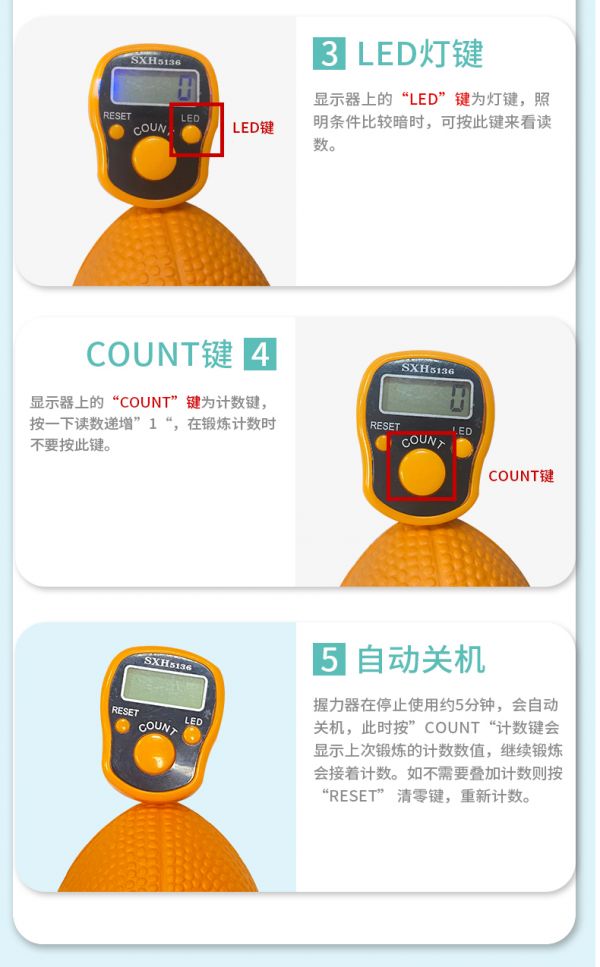 5、握力器在停止使用約5分鐘,會自動關機,此時按”COUNT“鍵會顯示上次鍛煉的計數(shù)數(shù)值,繼續(xù)鍛煉會接著計數(shù)。如不需要疊加計數(shù)則按”RESET”鍵清零,重新計數(shù)。