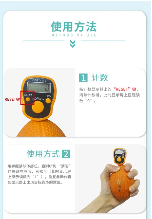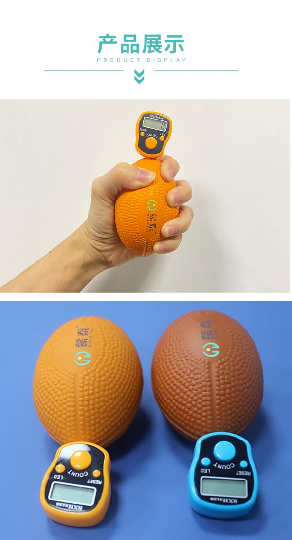 2、次握力器有計數(shù)功能,通過擠壓球體部位壓迫到球體內的計數(shù)鍵方可顯示計數(shù),力度沒有達到則不顯示計數(shù),確保達到有效的鍛煉。