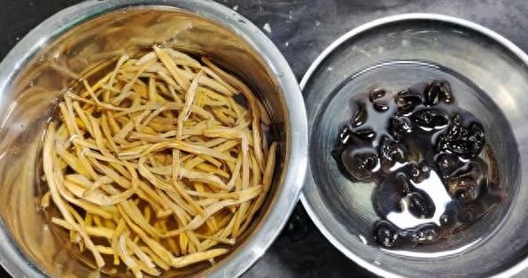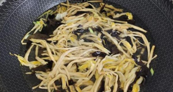 1.燒熱鍋中的食用油,加入蔥姜炒香后,加入黃花菜和干木耳一同翻炒,使其均勻受熱,增加菜肴的鮮香味。