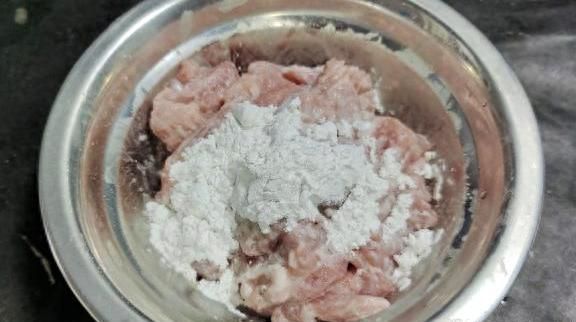 準備一點紅薯粉,加入開水?dāng)嚢杈鶆?。請記住,為了獲得更好的口感和口感,我們建議使用紅薯粉,并使用開水稀釋。將調(diào)好的紅薯粉漿倒入肉片中,攪拌均勻。然后再加入半湯匙的干紅薯粉,繼續(xù)攪拌均勻備用。