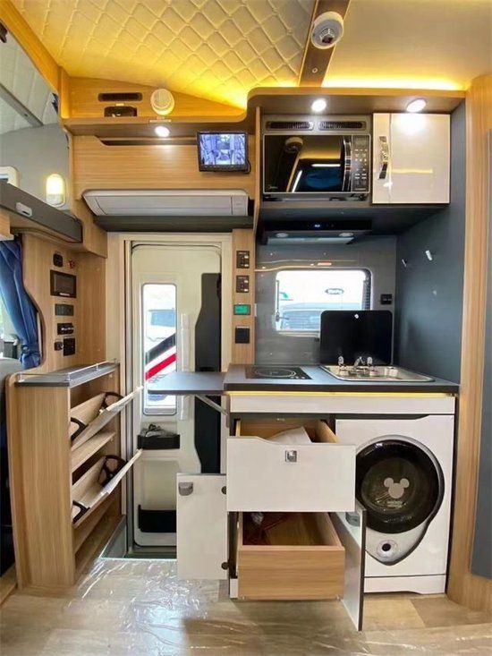 會(huì)客區(qū)為傳統(tǒng)的對(duì)向四人位卡座設(shè)計(jì),桌板上和墻面的位置有杯架,頂部為三個(gè)儲(chǔ)物吊柜。廚房位置擁有折疊桌板,桌面上為電磁爐和帶蓋板的洗菜池,頂部為多功能微波爐。下方則是櫥柜和洗衣機(jī)。旅途中基本的做飯和洗衣需求可以得到保證。
