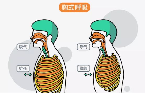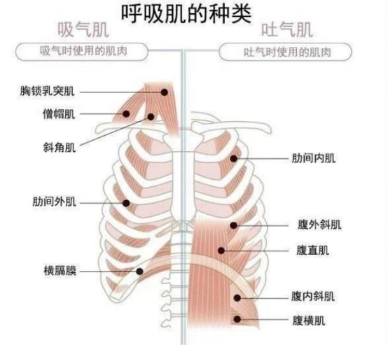 在人體系統(tǒng)中,呼吸并不是靠著肺部的力量膨脹、收縮,而是靠著周圍連結(jié)的肌肉進行運動,來完成吸氣和吐氣的動作。在呼吸運動時必須使用的肌肉,統(tǒng)稱為“呼吸肌”。包括肋間肌、膈肌、腹壁肌、胸鎖乳突肌、背部肌群、胸部肌群等,其中吸氣肌包括膈肌和肋間外?。缓魵饧“ɡ唛g內(nèi)肌和腹壁肌,人體呼吸的方式主要有腹式呼吸和縮唇呼吸。