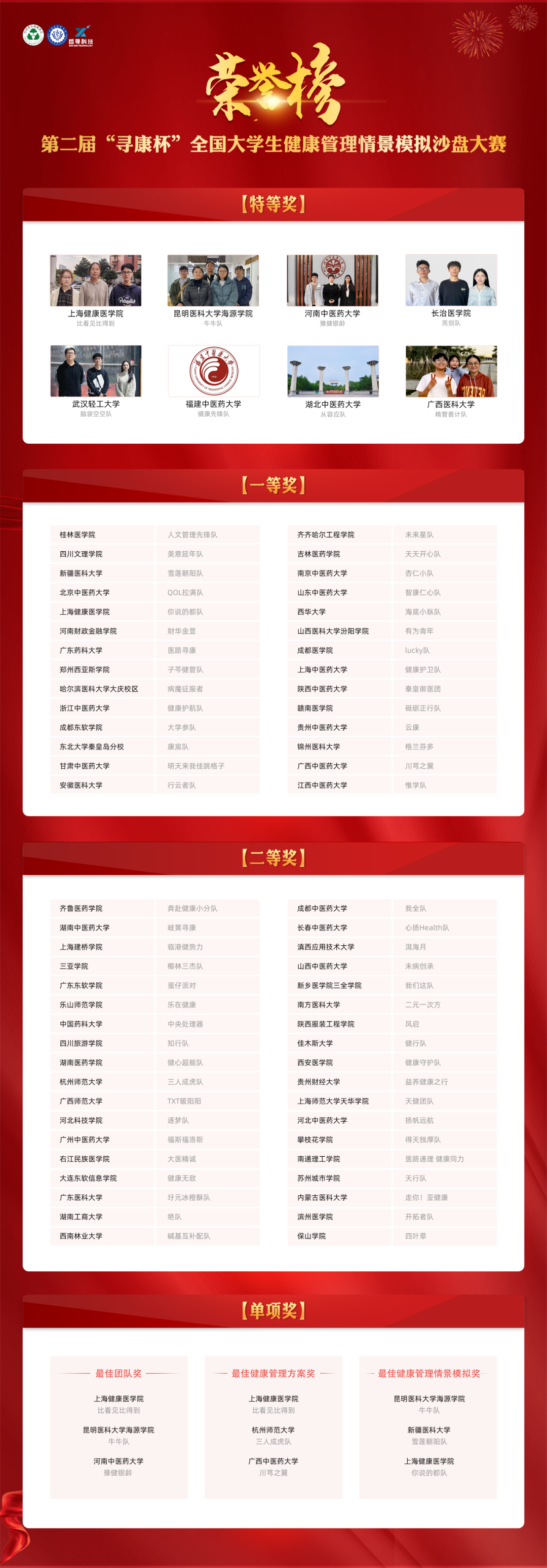 隨后舉行頒獎儀式,由大賽評委組以及與會領(lǐng)導(dǎo)嘉賓為獲獎團隊頒發(fā)了證書和獎杯。經(jīng)過一天半的激烈角逐,最終8個團隊榮獲特等獎,28個團隊榮獲一等獎,36個團隊榮獲二等獎。另有3個最佳團隊獎,3個團隊榮獲最佳健康管理方案獎,3個團隊榮獲最佳模擬對抗獎。獲獎名單如下: