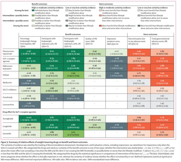 這項Meta分析顯示,芬特明-托吡酯和GLP-1受體激動劑是減重效果最顯著的藥物,GLP-1受體激動劑中司美格魯肽的療效最佳。