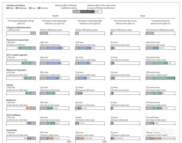 與單獨改變生活方式相比,除普蘭林肽外,其他減重藥物有更高比例的參與者達到體重下降≥5%。除二甲雙胍、SGLT2抑制劑和普蘭林肽之外,其他減重藥物相比單獨改變生活方式有更高比例的參與者達到體重下降≥10%。