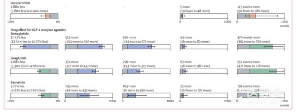 根據體重相對基線的變化情況,除左卡尼汀外,其他減重藥物相比單獨改變生活方式都可以降低更多體重;其中,芬特明-托吡酯和GLP-1受體激動劑的減重效果最佳。