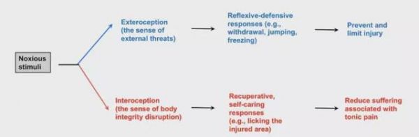 作者認(rèn)為外感受是無意識(shí)或有意識(shí)地感知到外界威脅并產(chǎn)生反射性或防御性行為,如逃避、jumping,以避免刺激損傷軀體;當(dāng)軀體完整性已受到損傷,軀體會(huì)產(chǎn)生持續(xù)性疼痛的內(nèi)感受,產(chǎn)生self-caring行為,如licking,以緩解持續(xù)性疼痛的痛苦。