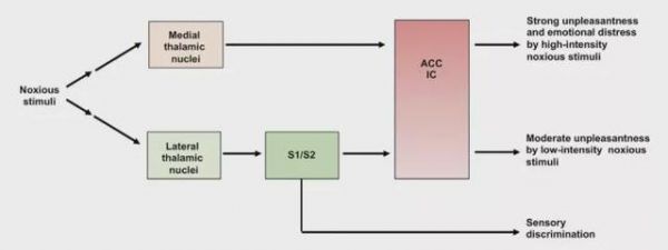 因此,外側(cè)丘腦-感覺皮層通路可能介導(dǎo)外感受,如感覺辨別,而內(nèi)側(cè)丘腦-ACC/IC通路介導(dǎo)內(nèi)感受,如對(duì)刺激的不快感。