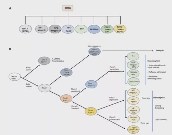 單細(xì)胞RNA測(cè)序?qū)RG神經(jīng)元分為11類神經(jīng)元。根據(jù)發(fā)育標(biāo)志物,DRG神經(jīng)元可被分為Runx1-persistent、Runx1-transient和Runx1-negative神經(jīng)元。這三類神經(jīng)元從功能上大致分別介導(dǎo)外感受行為、內(nèi)感受行為和受到傷害性刺激時(shí)產(chǎn)生的first pain。