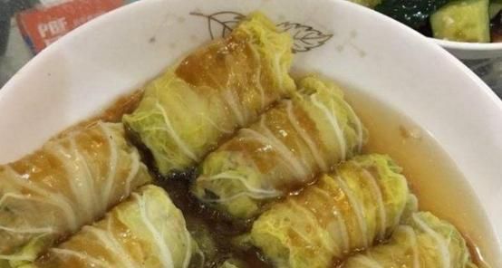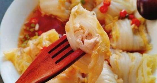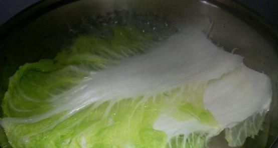 接著我們把大白菜外邊的葉子摘掉,留下比較嫩的白菜葉,用水清洗浸泡后,瀝干水分備用,把蒜頭剝掉皮切成蒜泥,香蔥洗干凈切成蔥段,辣椒切成小段,在鍋中倒入清水,用大火把水少沸騰后,將白菜葉放進(jìn)沸水中燙上三十秒左右,就可以撈出來(lái)了,然后我們把雞胸肉放到白菜葉的中間,用白菜葉將雞胸肉給卷起來(lái),卷完全部的白菜葉后放入一個(gè)碟子里。