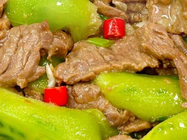 準備食材:牛肉,絲瓜,小米辣,蒜末,姜絲,小米辣,蔥花。