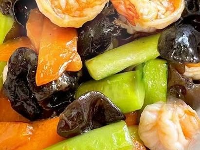 4、再次起鍋燒油,油熱后放入胡蘿卜、黃瓜和黑木耳翻炒一會兒,炒至斷生后放入蝦仁,加入食鹽和水淀粉,翻炒幾下即可出鍋裝盤開吃。