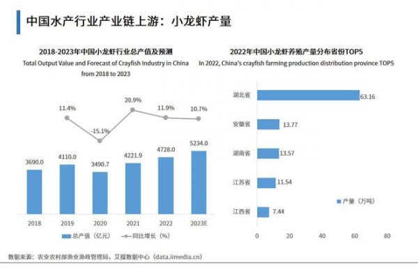 數(shù)據(jù)顯示,2022年中國小龍蝦產(chǎn)業(yè)總產(chǎn)值為4728.0億元,同比增長11.9%;小龍蝦產(chǎn)業(yè)正蓬勃發(fā)展,2022年小龍蝦養(yǎng)殖總產(chǎn)量為112.97萬噸,其中湖北省為63.16萬噸,位列第一。2023年,在餐飲店堂食得到恢復后,小龍蝦作為大眾喜食菜品,連鎖店、流動攤位、街邊小吃店將出現(xiàn)增長,帶動小龍蝦的菜品多樣化、品牌化、連鎖化。小龍蝦全產(chǎn)業(yè)鏈產(chǎn)值不斷提升,成為推進鄉(xiāng)村振興、壯大縣域經(jīng)濟的重要特色產(chǎn)業(yè)。