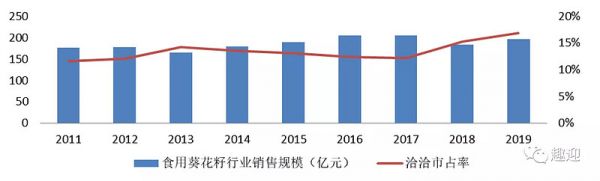 由于進入門檻低,行業(yè)中還存在大量個體散裝瓜子經(jīng)營主體。以中國葵花籽食品用量和洽洽葵花籽類產(chǎn)品收入為基礎(chǔ),假設(shè)葵花籽產(chǎn)品平均售價為20 元/千克,推算2019年食用葵花籽行業(yè)銷售規(guī)模為196 億元,洽洽全市場占有率達到16.85%,包裝與散裝比例約為1:2。隨著城鎮(zhèn)化進程加快和消費升級,散裝瓜子會因質(zhì)量問題等原因退出市場,洽洽可利用品牌優(yōu)勢和渠道優(yōu)勢擠壓散裝瓜子市場,加速行業(yè)集中,提高市場占有率。