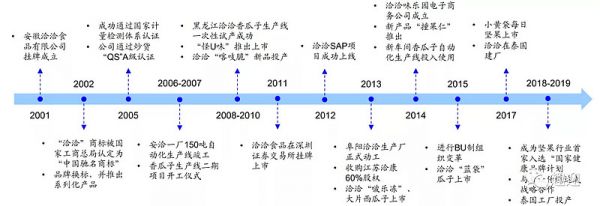 洽洽食品成立于2001年;2002年“洽洽”商標(biāo)被國家工商總局認定為“中國馳名商標(biāo)”;2011年深交所上市;2013年收購江蘇洽康60%股權(quán);2014年洽洽味樂園電子商務(wù)公司成立;2017年推出小黃袋每日堅果。