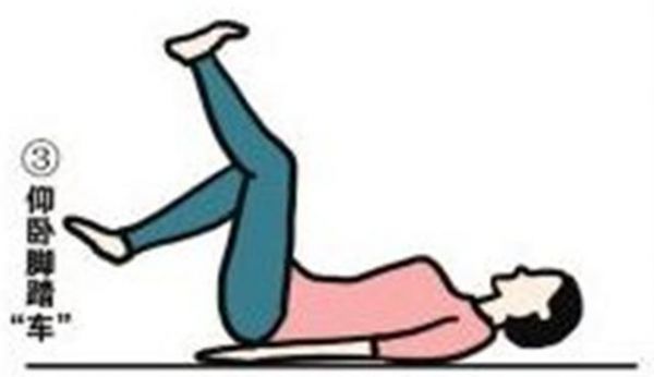 仰臥位,雙手托起臀部兩側,屈膝屈髖,模仿騎自行車動作,做90度位置踏空動作。