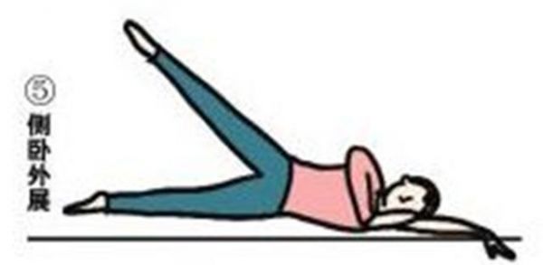 側臥位,雙腿伸直,上抬單側腿,以無痛為度,至最大幅度。