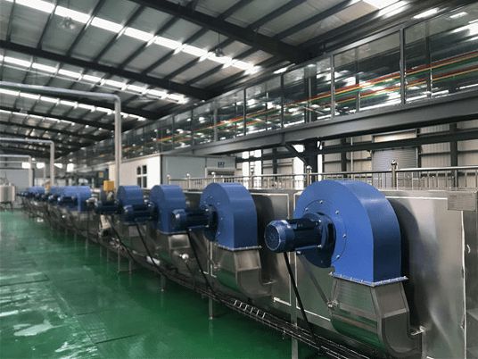 接下來是連續(xù)漂燙設(shè)備。這個設(shè)備的作用是對清洗后的果蔬進行連續(xù)漂燙,去除果蔬中的酶和微生物,保證果蔬的質(zhì)量和口感。然后是冷卻設(shè)備。這個設(shè)備的作用是對漂燙后的果蔬進行冷卻,使其溫度降低到適合脫水的溫度。