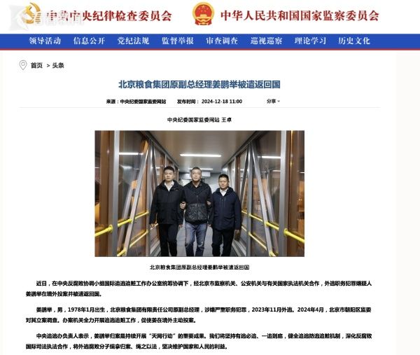 北京糧食集團(tuán)原副總經(jīng)理姜鵬舉被遣返回國(guó)