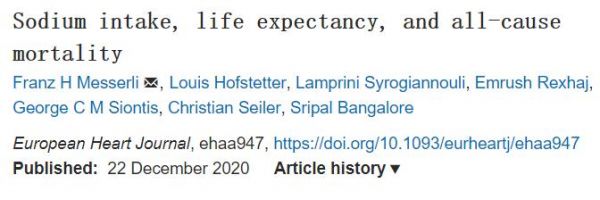 Franz H Messerli,et al.Sodium intake, life expectancy, and all-cause mortality.European Heart Journal.2020.https://doi.org/10.1093/eurheartj/ehaa947