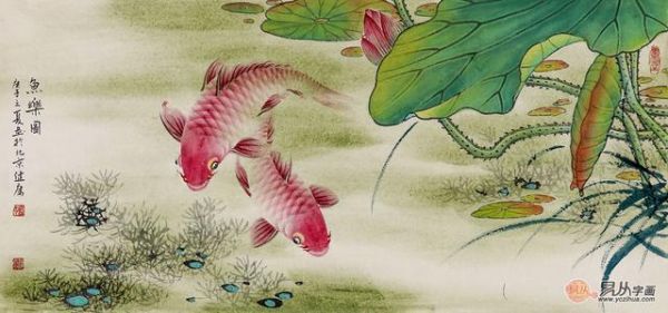 畫家在創(chuàng)作鯉魚圖的時(shí)候,通常都會(huì)與荷花進(jìn)行搭配,來達(dá)到畫面的完整度,荷花鯉魚結(jié)合在一起,一靜、一動(dòng),分外有趣。荷花的靜雅襯托了鯉魚的活潑可愛,也讓整幅畫都充滿了淡雅、沁人心脾的花香。