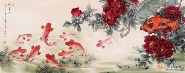 中美協(xié)會(huì)員 藍(lán)健康工筆牡丹九魚圖《滿堂紅》作品來源:易從字畫