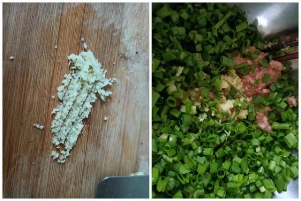第二步:處理肉餡,姜切碎米,蔥切碎放入肉餡中。